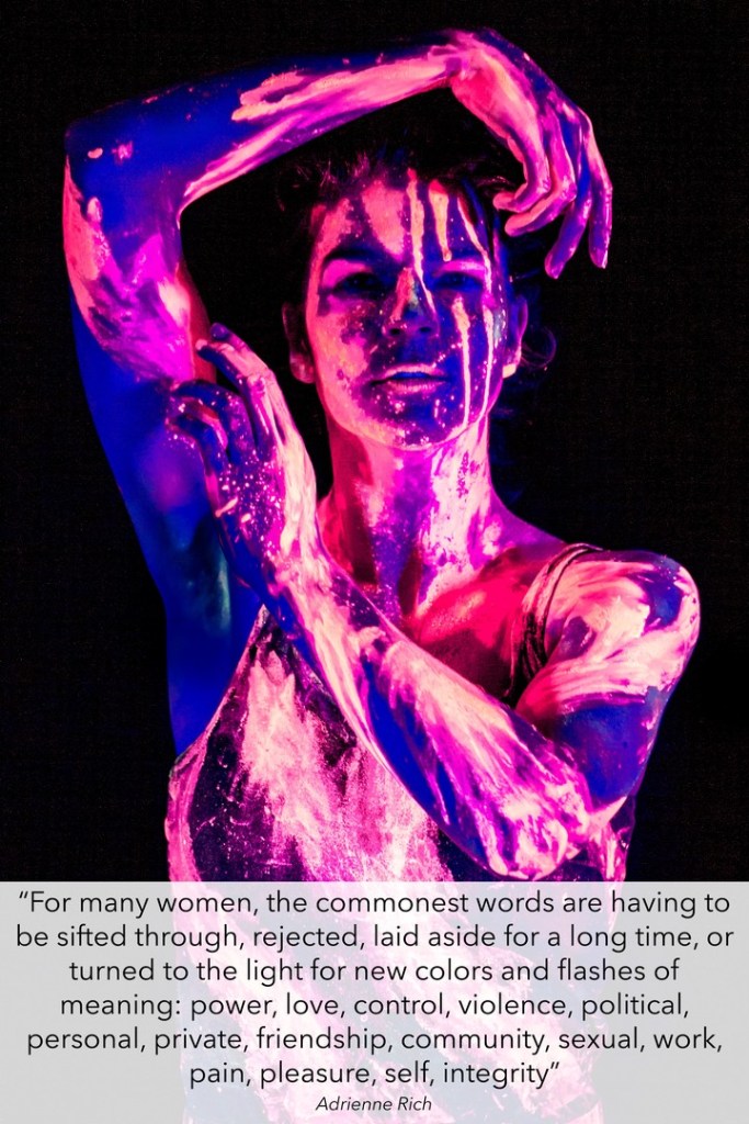 “For many women, the commonest words are having to be sifted through, rejected, laid aside for a long time, or turned to the light for new colors and flashes of meaning: power, love, control, violence, political, personal, private, friendship, community, sexual, work, pain, pleasure, self, integrity” — Adrienne Rich