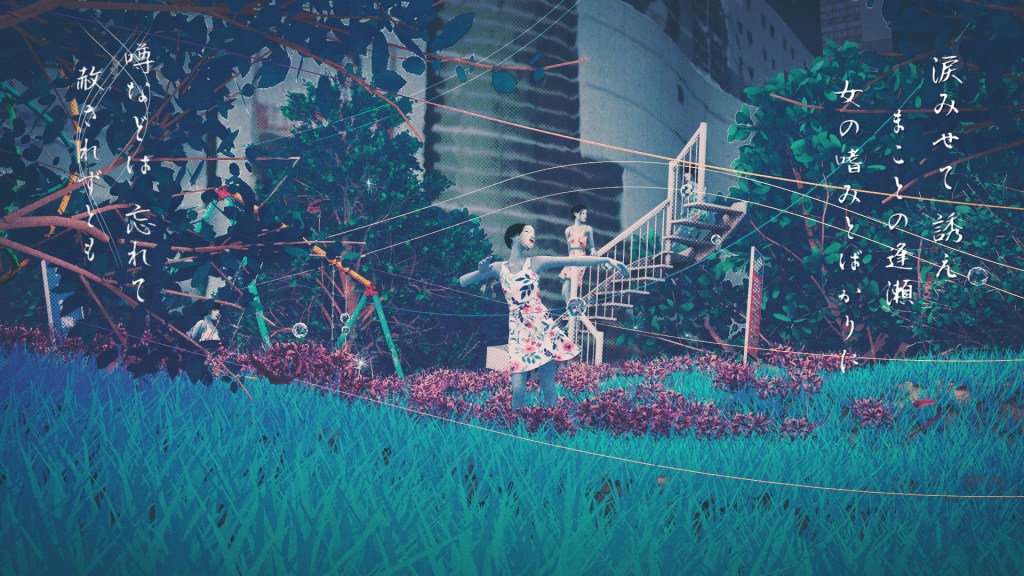 The Japanese lyrics in this song is composed of ancient Japanese words which are used before Edo era. How these lyrics display on the screen was inspired by “Ukiyoe” which is Japanese traditional painting. Ukiyoe is a painting consists of a picture and words. Those words could be story of the painting or character’s lines.
