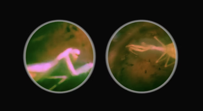 Filmed entirely within the boundaries of my home, 20/20 explores camera AI, various viewpoints, multiple mantis characters and animation to explore the idea of sight and information processing via an eyesight testing stage. The only voice that is real is the optometrist, and even he’s long dead. 20/20’s a generative piece – a chorus of distant cicada cousins bought together, AI puppet voices, moving viewpoints and a slow burn. Ideas of nature, looking somewhere else for help and an inability to understand or see anything the same as others are referenced with wry humour.