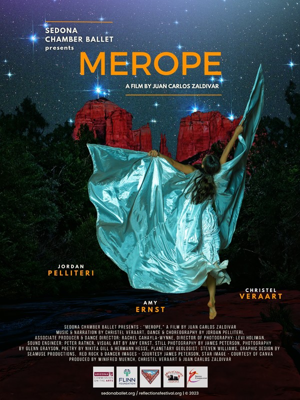 The short film, Merope, follows a personification of the hidden star on a journey towards emancipation from the ties that historically have bound her and her six sisters, the Pleiades constellation, in a narrative about captivity and victimization, towards a new story where she claims visibility and a more authentic place in the universe for her and her sisters.